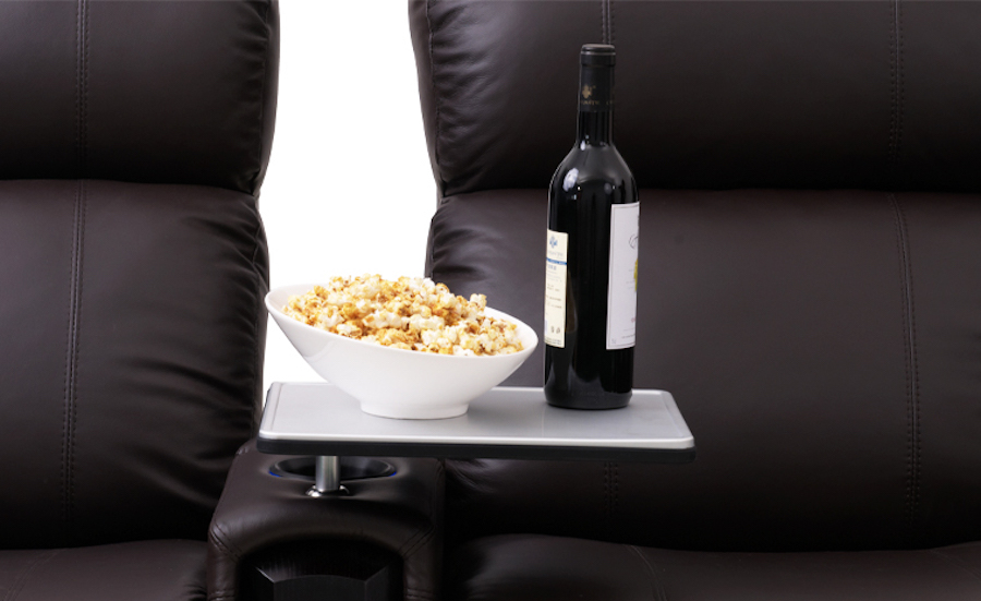 Octane has a couple of other tricks to ensure that your home theater doesn't end up with the dirty floors of the local movieplex. If you enjoy a good glass of wine with your movie, their custom wine glass holder will ensure that it doesn't get accidentally knocked over in the dark – or when a frightening scene almost makes you jump out of your seat. And to make sure the popcorn doesn't fly either, an innovative double-walled popcorn and snack bowl keeps your favorite snack secure. It also swivels on the integrated mount in the seat, so the person next to you never has to poke you to pass the popcorn.