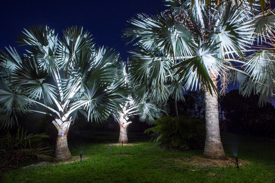 Want to add drama to your trees? Uplight them with a light pointed upward toward the canopy. Lighting has a way of directing the eye, so uplighting can make your trees look more dramatic at night, as they stand out in the dark with no competition from the horizon. It’s perfect for tall palms, oaks, and many other species. What happens when you have shrubs or flowers around your tree? You don’t want your uplight obstructed. With the speed at which things grow in Florida, the solution is simple. Put your uplight on riser stakes that just clear the foliage, keeping them concealed but clearing the light path.