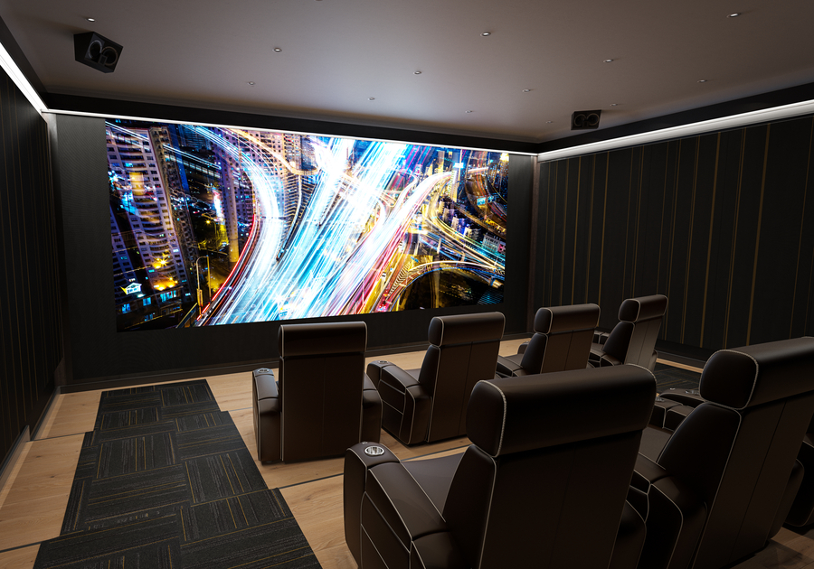 Once you know how many seats you'll be designing for, you can think about the visual system. Depending on your theater's size, you can opt for a mega-size flat-panel TV, a short-throw projector and screen, or a traditional projector and screen. Then there is a myriad of options for screen types, projector types, and models for specific content. It isn't very easy to choose. We ask you how you will use your theater, what you like to watch, and if you will watch with some light in the room or not. All those things – and much more – influence the choice of visual equipment.