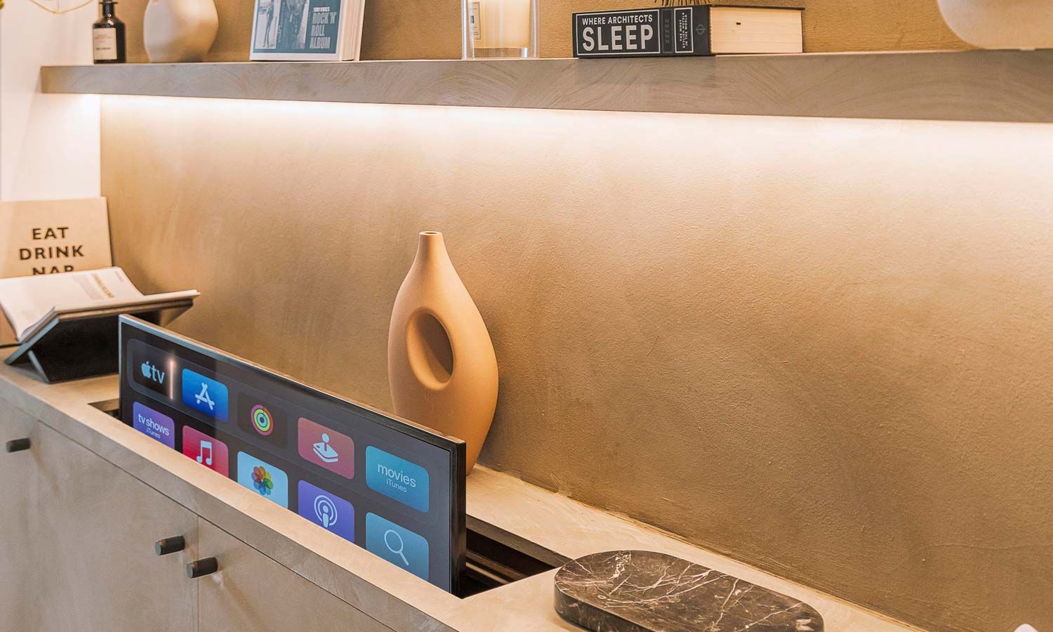 - Wall-mounted TV completes the entertainment space
